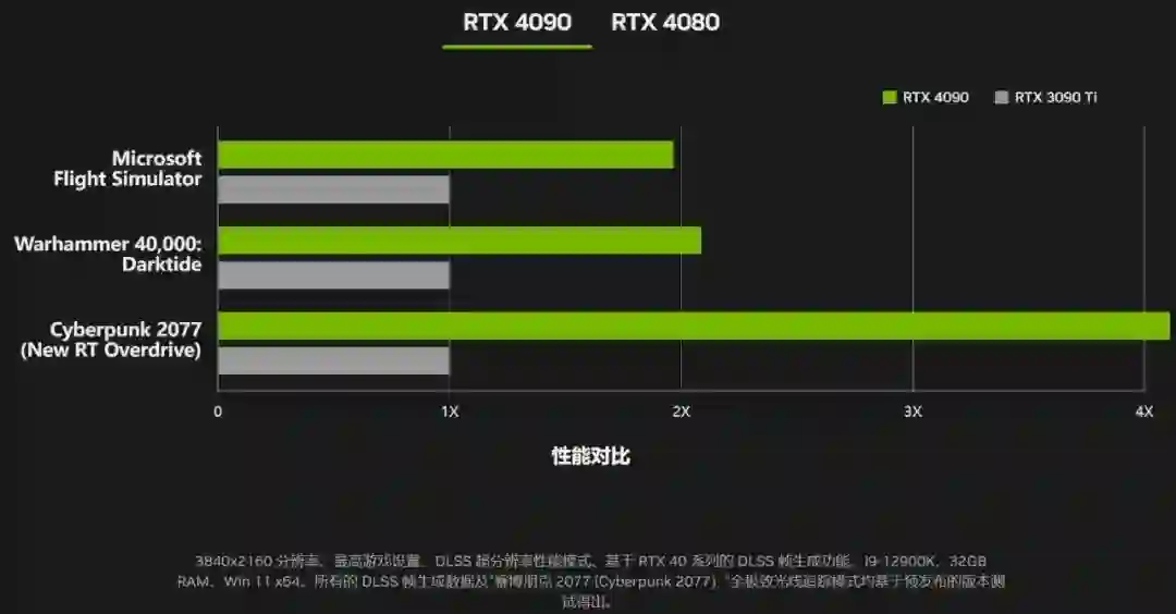 再往下,RTX 4080 可在开 DLSS 时达到 3080Ti 的两倍性能。