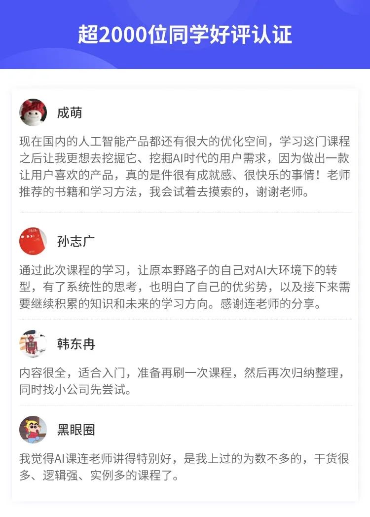 这门课程目前已经帮助超过3000名正在探索AI发展方向的产品经理成功入门,收获好评不计其数,如下,供你参考: