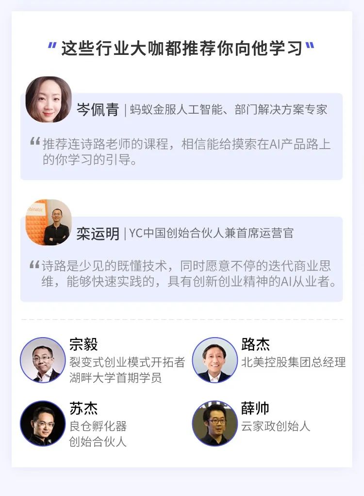 在15天的课程中,连诗路老师将用其多年的实战和研究,带大家深入到行业最前沿,不仅分享了做AI产品的产品观点、产品打磨流程、AI产品需要的资源、AI产品发布运营等方面的实践,也对同学们入门AI产品经理岗位未来需要深度学习的方向提供了建议。