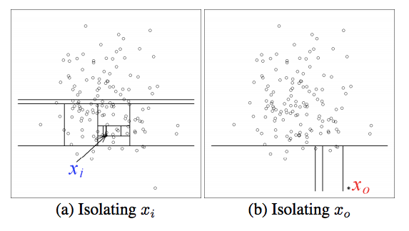 Isolation Forest的思路就是,如果是normal数据,你需要更多地切割平面才能区分这条数据。如果是anormal数据,就可以用较少的平面切割。如下图所示: