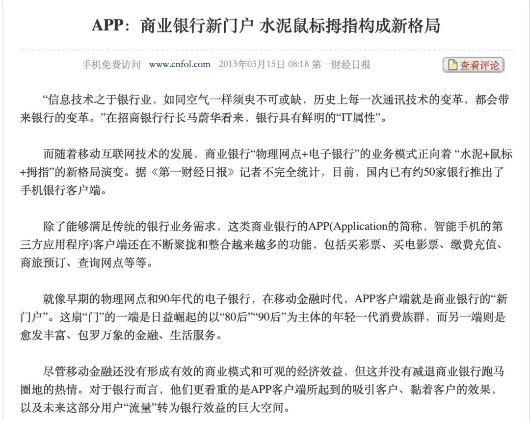 今天,翻到了一篇6年前写的旧文。彼时,正值移动互联网红利爆发的前夜。过去银行物理网点+电子渠道的模式开始转为「水泥+鼠标+拇指」的格局,商业银行App(包括手机客户端、手机银行等)的战略价值刚刚开始发力。