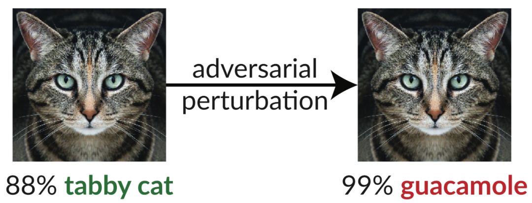 上图展示了一个「对抗样本」:仅仅加入了一些轻微的扰动,这张猫的图片就可以愚弄 InceptionV3 分类器,使其将图片分类为「鳄梨酱」。这类「欺骗性图像」可以轻松地利用梯度下降法生成(Szegedy et al. 2013)。