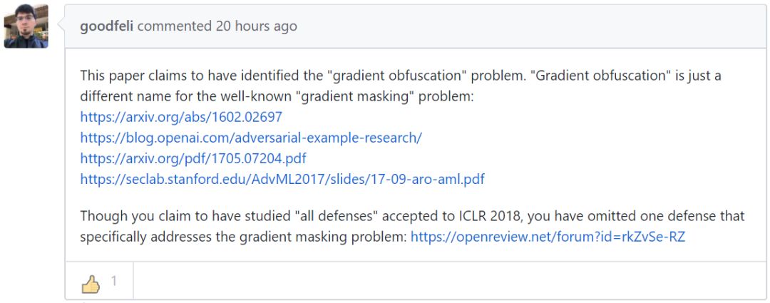 这篇论文甫一出现,立刻引起了研究社区的关注,GAN 提出者 Ian Goodfellow 也参与了讨论。Goodfellow 指出「混淆梯度」的概念实际上与此前人们提出的「梯度遮蔽(gradient masking)」概念相同。同时 ICLR 2018 中的一篇论文《Ensemble Adversarial Training: Attacks and Defenses》(Goodfellow 也是作者之一)实际上解决了这一问题。不过,这一观点并未被 MIT 与 UC Berkeley 的论文作者完全接受。