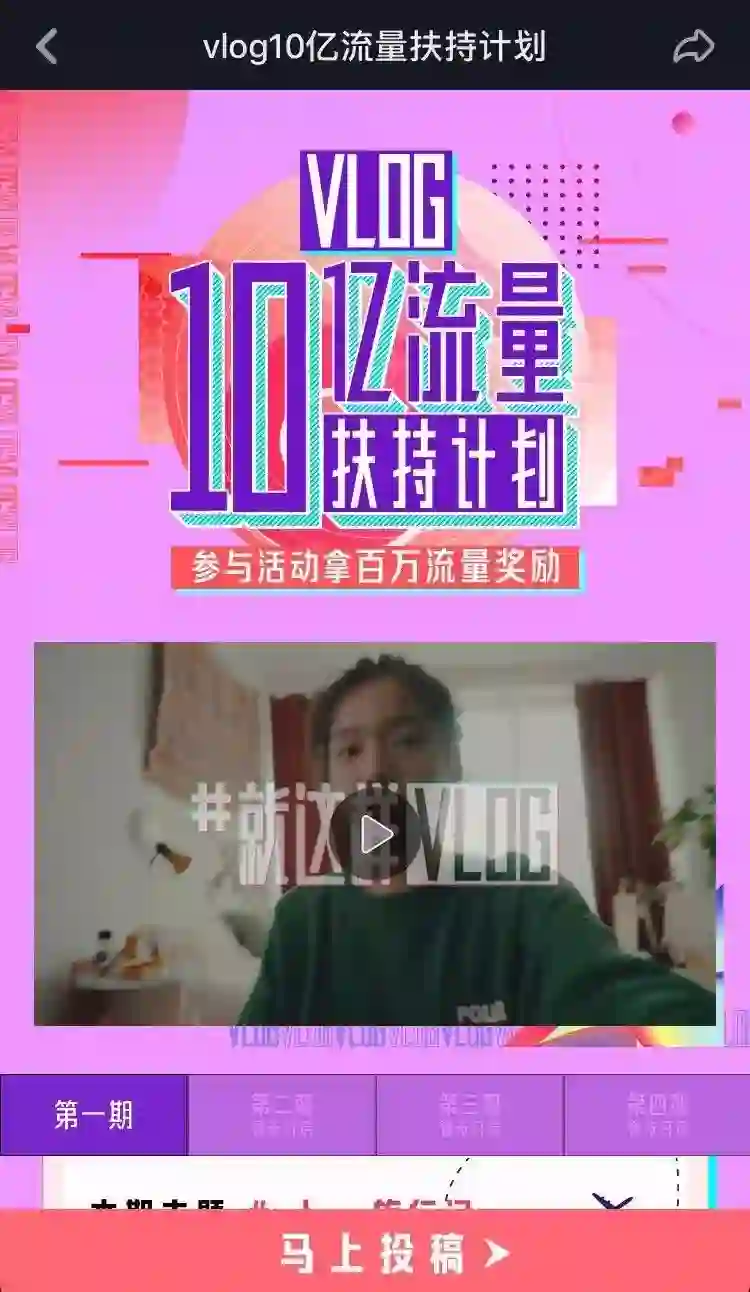 回到抖音最近的举措上,此次Vlog10亿流量扶持计划将分4期进行,每期都有相应的主题。从4月25日起,用户拍摄或上传时长大于30s的原创Vlog视频,加上相应话题标签,即可参与“Vlog 10亿流量扶持计划”。