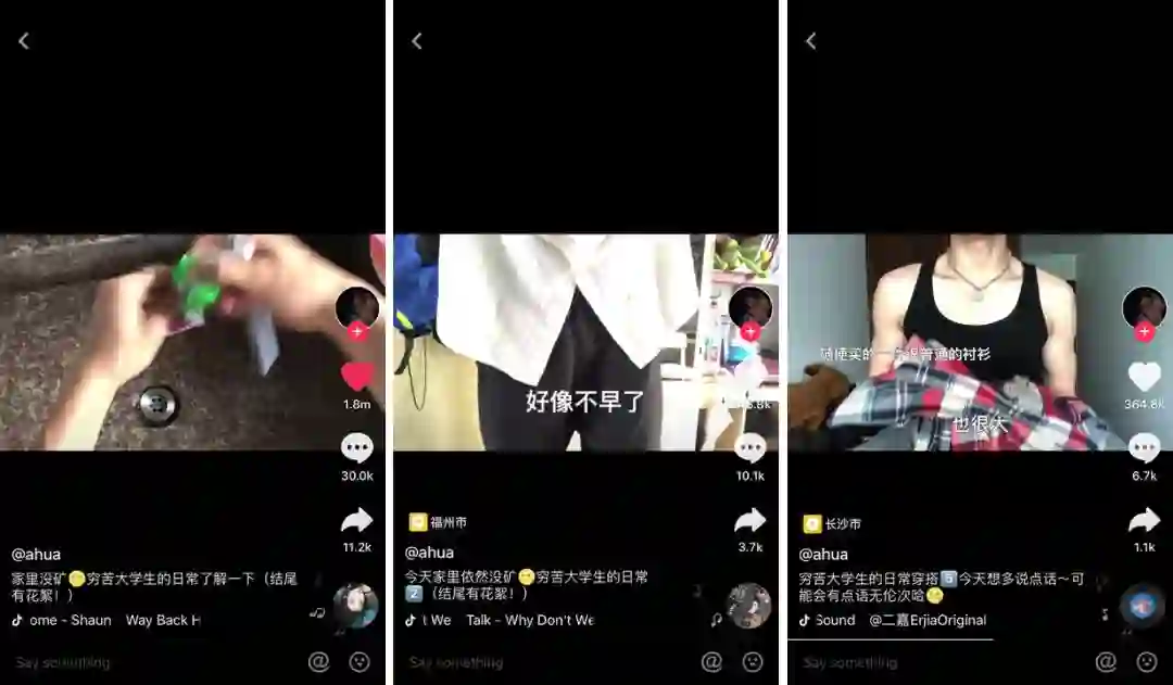 这条视频获得180万点赞,在此基础上,「ahua」又拍摄了10支“贫苦”系列,“贫苦学生的穿搭”等衍生视频,为他带来近500万粉丝。如他所说:“凭什么普通大学生的生活不能被记录?”