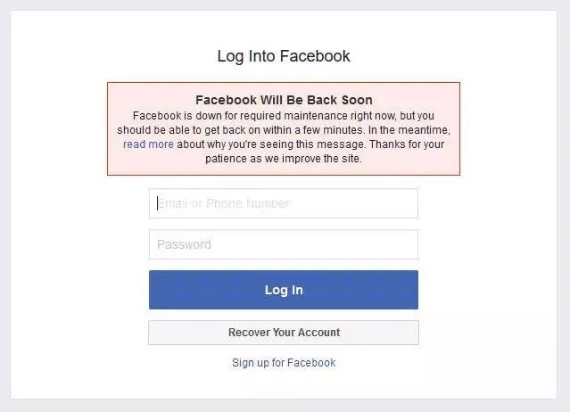 “帐户暂时不可用”是 Facebook 用户在登陆时收到的消息提醒。 “由于网站问题,您的帐户目前无法使用。我们将尽快解决此问题。请在几分钟后重试。”但事实上 Facebook 挂了整个白天,截止到现在 (美国当地时间下午 8 点)还没有恢复。