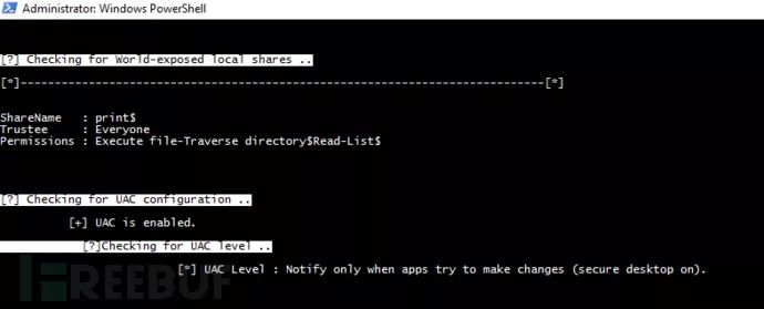 上图显示,脚本为我们枚举出了每个人的本地共享,并且“用户帐户控制”已启用。