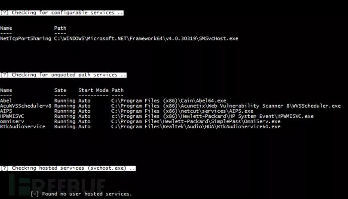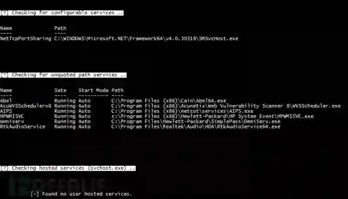 上图显示,脚本为我们枚举出了在后台运行的可配置和非引用路径服务。