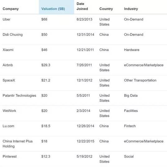 CB Insights被称为美国硅谷VC数据智库,是全球风投机构的风向标。榜单显示,Uber以680亿美元估值成为全球最具价值的科技创业公司,来自中国的滴滴出行、小米分别以500亿美元、460亿美元估值位列第二、三位。