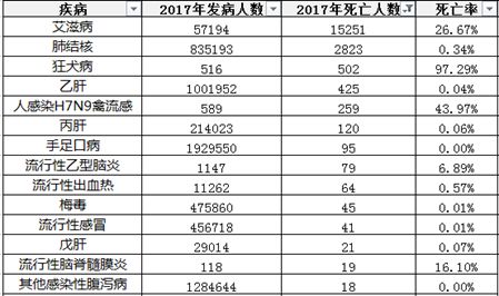 更进一步,全国一年能死亡100人以上且死亡率超过1%的传染病只有三种:艾滋病,狂犬病,H7N9禽流感。所以我们为什么总是能在电视新闻上看到禽流感的新闻,因为这是全国致死人数第三,而且死亡率超过40%的恶性传染病。
