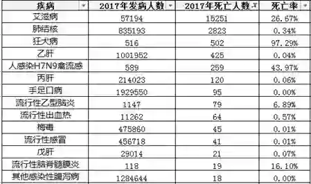 下图是我根据2017年中国疾病预防控制局数据制作的2017年中国传染病死亡率表格,2017年中国死亡人数超过10人的传染病只有14种,我们可以看到艾滋病遥遥领先,实际上2017年中国艾滋病死亡人数占传染病死亡人数的77.04%。