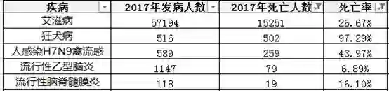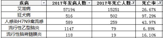 2017年中国死亡人数超过10人且死亡率超过1%的传染病只有5种,而其中狂犬病的死亡率遥遥领先高达97.29%,第二名的H7N9型禽流感死亡率也只有狂犬病的一半。