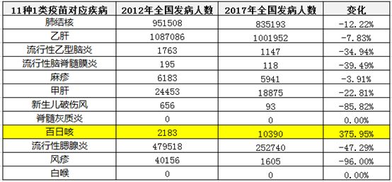 当然我们注意到,12种疾病中只有百日咳发病人数呈现大幅上升,从2012年的2183例增加到2017年的10390例。