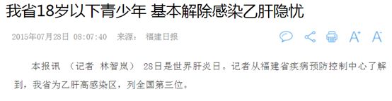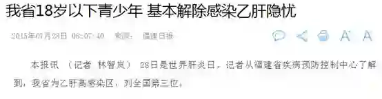 福建省是中国乙肝感染人数第三的乙肝大省,从2003年1月开始,福建省为全省儿童免费接种乙肝疫苗,到了2015年,福建省就宣布“我省18岁以下青少年,基本解除感染乙肝隐忧”