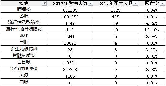 得病最严重的情况就是死亡,2017年这12种疾病全国死亡人数6人以上的仅有4种,其余8种疾病死亡人数都在5人及其以下,其中有5种疾病2017年死亡人数为0。12种疾病里面,死亡率高于1%的只有3种,这三种疾病全国总发病人数才1300多人(注意是全年龄段)。