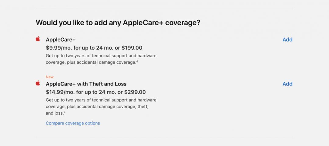 昨天的发布会结束后,苹果在美区官网更新了适用于 iPhone 的 AppleCare+ 全方位服务计划。其中适用于 iPhone XS、iPhone XS Max 的 AppleCare+ 新增了 Theft and Loss(被盗 / 丢失)选项,价格为 299 美元,分 24 个月支付的话,每个月需要支付 14.99 美元。一旦设备丢失,用户可以获得 269 美元的免赔额,这意味着当用户的损失额度超过 269 美元时可以获得苹果的赔偿。