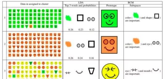基于实例的方法主要是通过一些代表性的样本来解释聚类/分类结果的方法。比如下图所展示的贝叶斯实例模型(Bayesian Case Model,BCM),我们将样本分成三个组团,可以分别找出每个组团中具有的代表性样例和重要的子空间。比如对于下面第一类聚类来说,绿脸是具有代表性的样本,而绿色、方块是具有代表性的特征子空间。