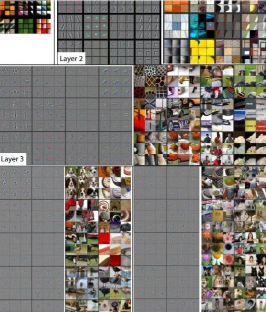 从实验结果可以看出来,第二层对应着一些边角或色彩特征,第三层对应着纹理特征,第四层对应着一些如狗脸、车轮这样的局部部位,第五层则对整体的物体有较强的识别能力。