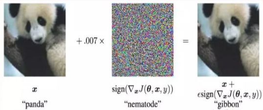 不可解释同样也意味着危险,事实上很多领域对深度学习模型应用的顾虑除了模型本身无法给出足够的信息之外,也有或多或少关于安全性的考虑。比如,下面一个非常经典的关于对抗样本的例子,对于一个CNN模型,在熊猫的图片中添加了一些噪声之后却以99.3%的概率被判定为长臂猿。