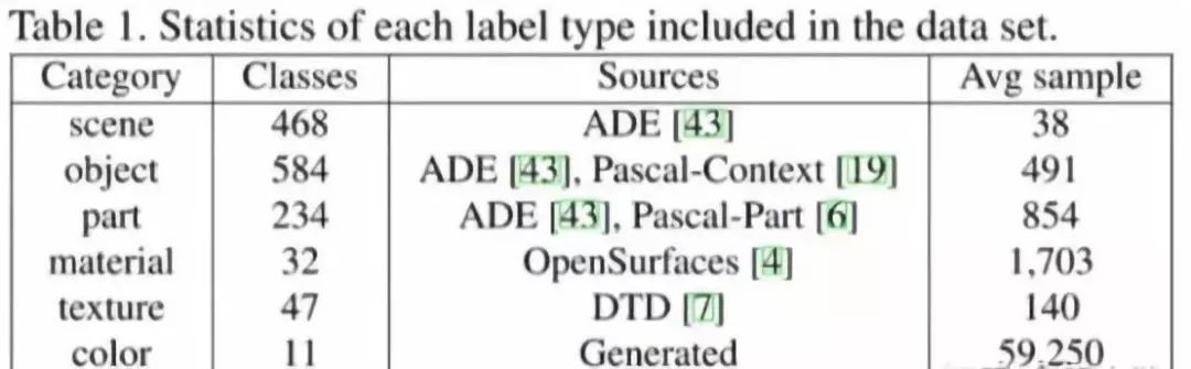 为了获得大量的视觉语义概念数据,研究人员收集了来自不同数据源的分层语义标注数据(包括颜色、材质、材料、部分、物体、场景这几个层次),如下图所示