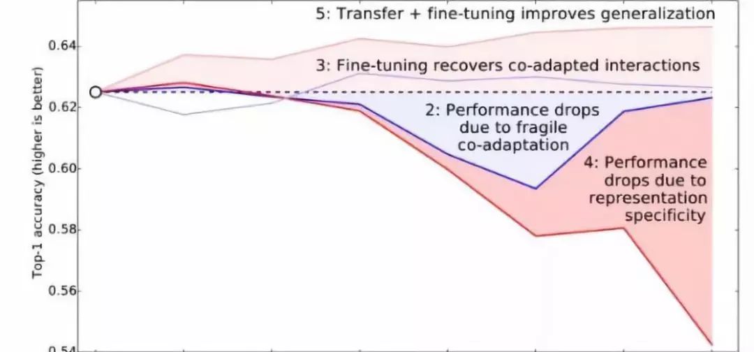 当然从低级概念到高级概念的一个过程中总是会伴随着一个非常有意思的现象:泛化性逐渐降低,特化性逐渐升高。比如在细胞层次上,人类和其他动物的区别比较小,这个层次的泛化性就高,但到组织器官层次区别就比较大,这个层次的特化性就高。Bengio团队在2014年发表的一篇工作《How transferable are features in deep neural networks》就是通过研究特征的可迁移性来对这个从泛化的特化的过程进行评估。