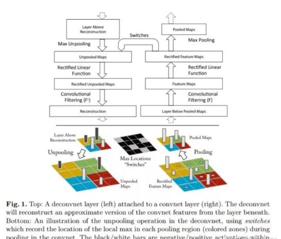 要理解神经网络中每层都学到了哪些概念一个非常直观的方法就是通过对隐层运用一些可视化方法来将其转化成人类可以理解的有实际含义的图像,这方面一个非常具有代表性的一个工作就是14年ECCV的一篇经典之作:《Visualizing and Understanding Convolutional Networks》,这篇文章主要利用了反卷积的相关思想实现了特征可视化来帮助我们理解CNN的每一层究竟学到了什么东西。我们都知道典型的CNN模型的一个完整卷积过程是由卷积-激活-池化(pooling)三个步骤组成的。而如果想把一个CNN的中间层转化成原始输入空间呢?我们就需要经过反池化-反激活-反卷积这样的一个逆过程。整个模型的结构如下图所示:
