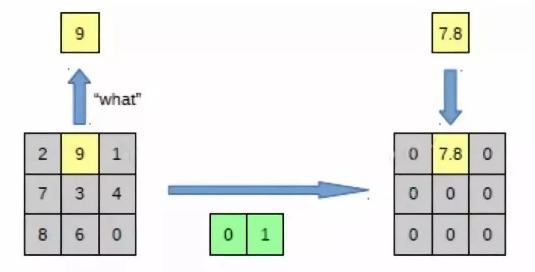 反池化其实很好理解,以下面的图片为例,左图可以表示是池化(pooling)过程,右图表示反池化(unpooling)过程,池化过程中我们将3*3的一个pooling块中的最大值取出,而反池化则是将pooling后的值恢复成3*3的像素单元,由于我们现在只有一个激活值, 所以只将该激活值对应原pooling块中位置的值还原回去,其他的值设定成0。所以在max-pooling的时候,我们不光要知道pooling值,同时也要记录下pooling值的对应位置,比如下图pooling值的位置就是(0,1)。