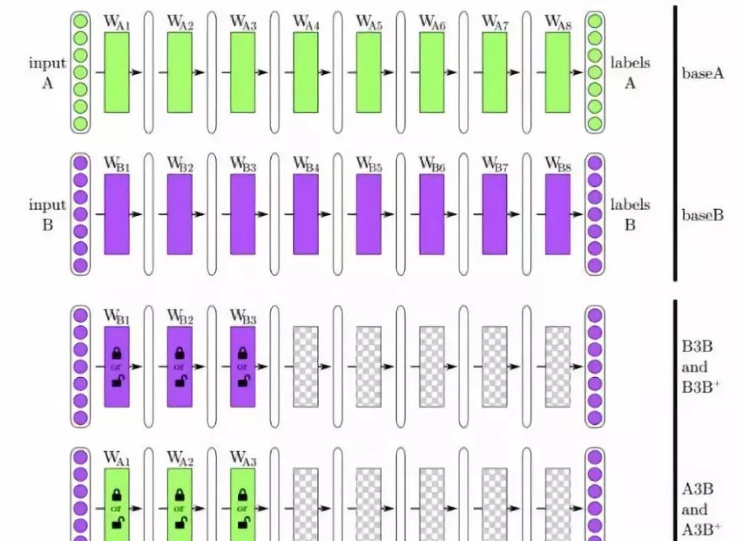一个迁移网络A3B+,网络结构和A3B一样,但所有层都是可学习的。