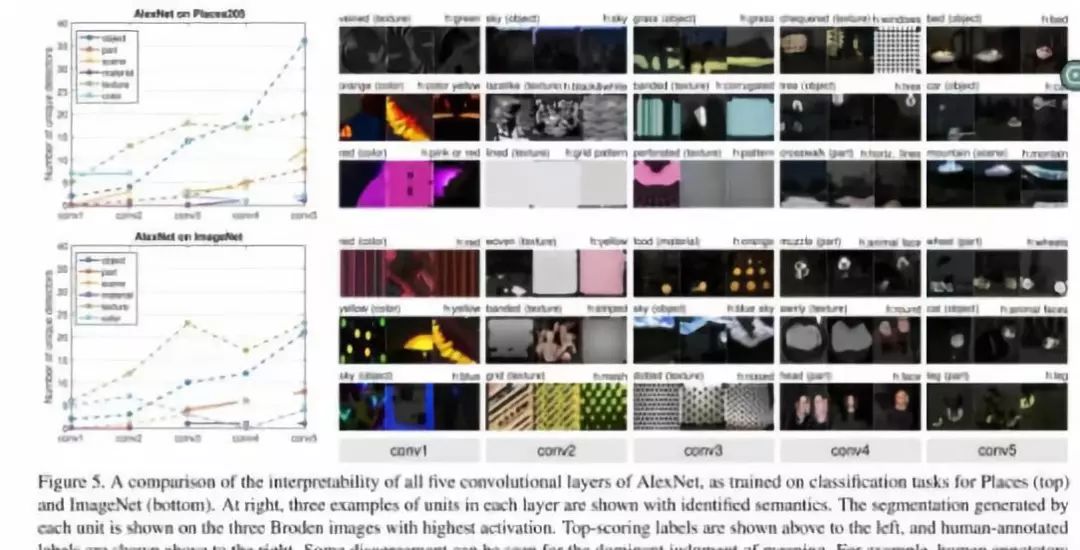 从实验结果中我们也可以发现随着层数的增加,神经网络学到的概念类型也逐渐变得高级,比如在AlexNet中,前面的卷积层对颜色、材质的识别力较强,后面的卷积层对物体、场景的识别力较强。特别是对物体的识别上,后面的卷积层有突出的优势。