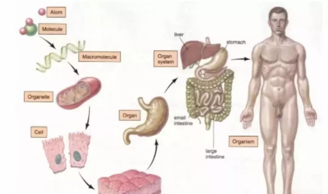 但实际上我们是知道这些参数的具体值以及整个训练过程的,所以神经网络模型本身其实并不是一个黑箱,其黑箱性在于我们没办法用人类可以理解的方式理解模型的具体含义和行为,而神经网络的一个非常好的性质在于神经元的分层组合形式,这让我们可以用物质组成的视角来理解神经网络的运作方式。比如如下图所示,人体的组成过程是从分子-细胞-组织-器官-系统-人体: