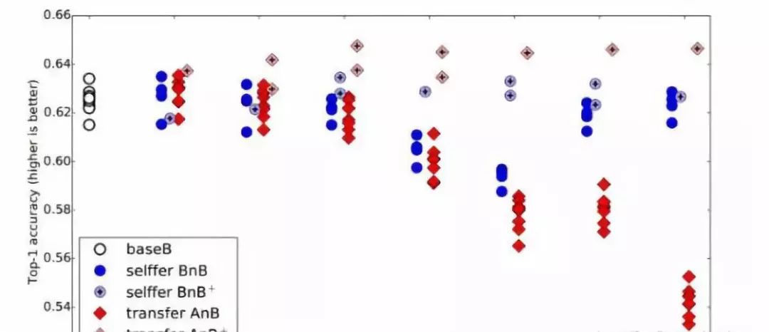 而从实验结果来看,transferAnB的随着层数的增加性能在不断下降(泛化降低,特化提升,这印证了我们对泛化特化性质随层数变化的基本判断),而控制组的selfferBnB的性能出现了先下降后上升的现象(泛化和特化都不足够的中间层既缺乏可学习性,特征的描述性又不够强,因而出现了性能下降的现象),transferBnB+和transferAnB+一直维持着比较好的性能,但其中transferAnB+的性能确是最好的,特征在迁移任务上表现出来的优势其实也对应了我们在上一节中讲的模型本身也意味着知识。
