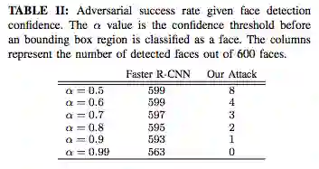 给定人脸检测置信度的对抗成功率。α值是边界框区域被分类为人脸之前的confidence threshold,右边两列表示600张照片中检测到脸部的数量。