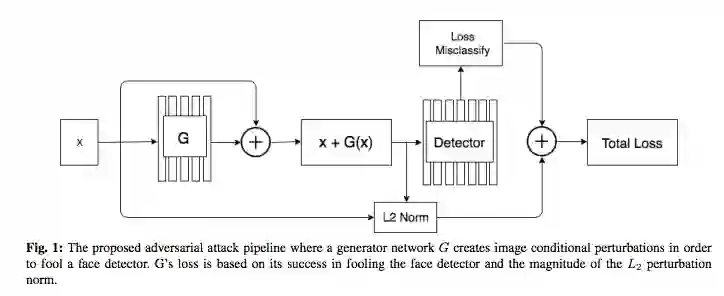 所提出的对抗攻击的pineline,其中生成器网络G创建图像条件干扰,以欺骗人脸检测器。