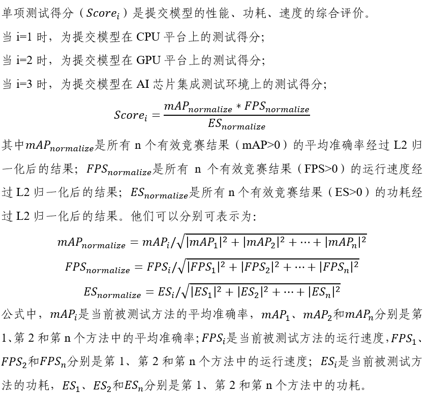 为了方便团队内部和大会组委会测试算法模型,各竞赛团队需提供可用、真实的算法模型和相关测试代码,并提供对应的使用说明文档,说明文档内容包括测试方法用例介绍。算法实现的语言必须使用python,框架使用pytroch、tensorflow、keras中的一种,GPU和小型嵌入式AI芯片上测试使用cuda9或cuda10。
