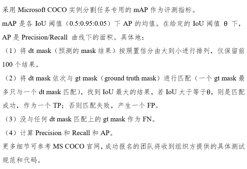 拟采用的组织方式为主办方在虚拟测试环境(Ubuntu)和测试样本数据上测试参赛队提交的算法模型,通过验证运行可执行程序的输出结果,综合评价模型在多平台上的性能、功耗、速度指标,评出名次(为防止作弊,主办方不公布测试集,但与Microsoft COCO数据集中的实例分割任务(Instance Segmentation)的数据相同(非removed的类别,共80类))。