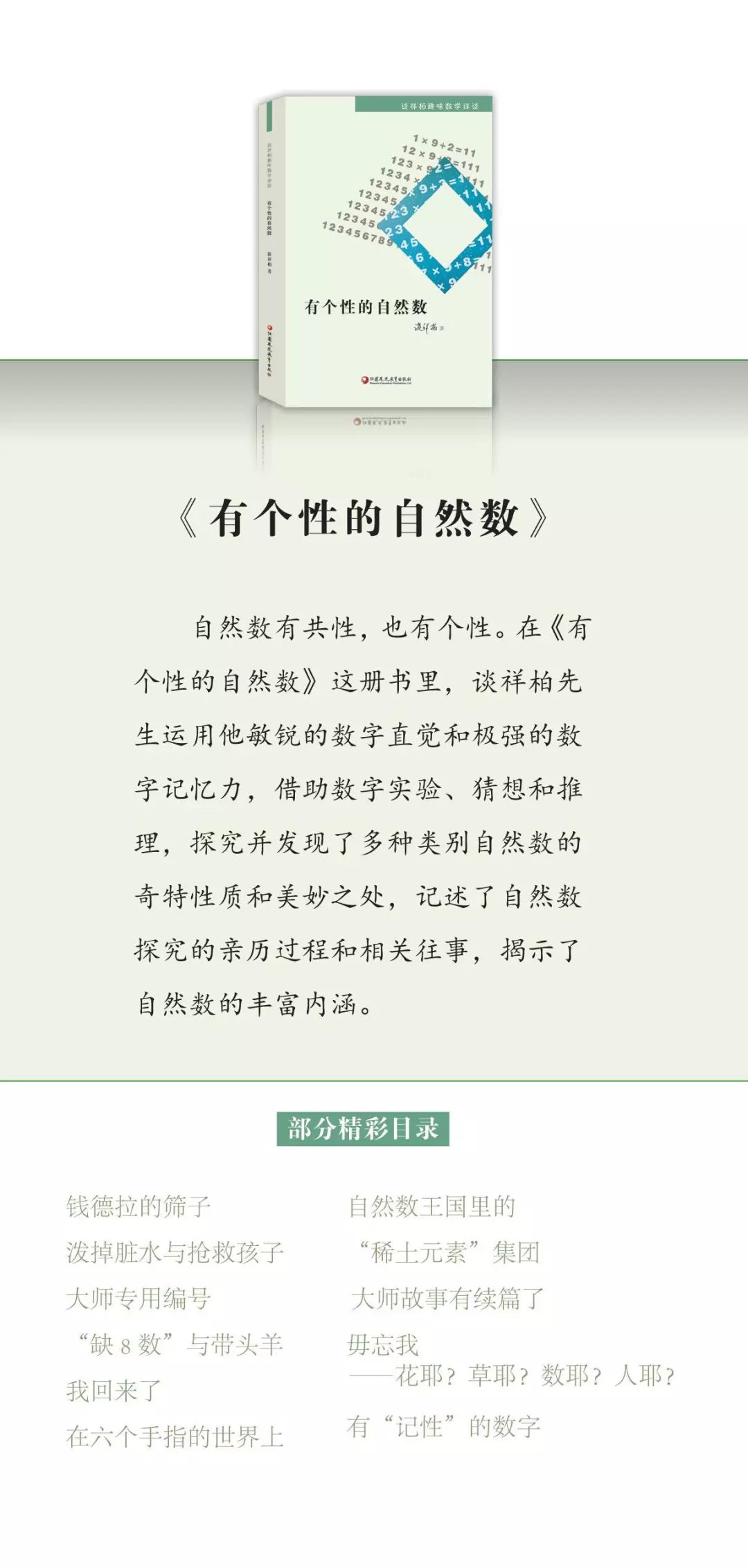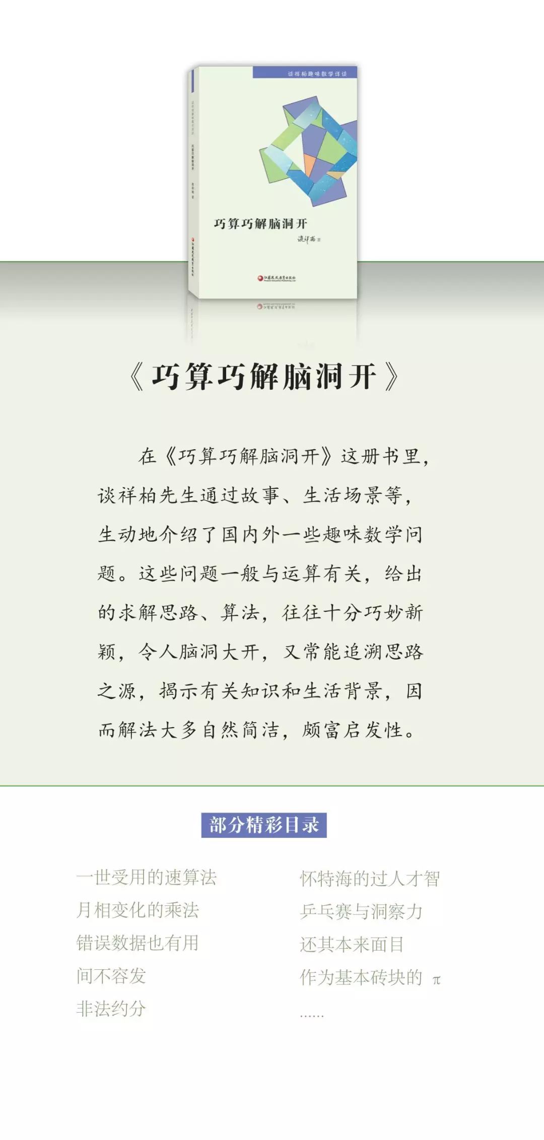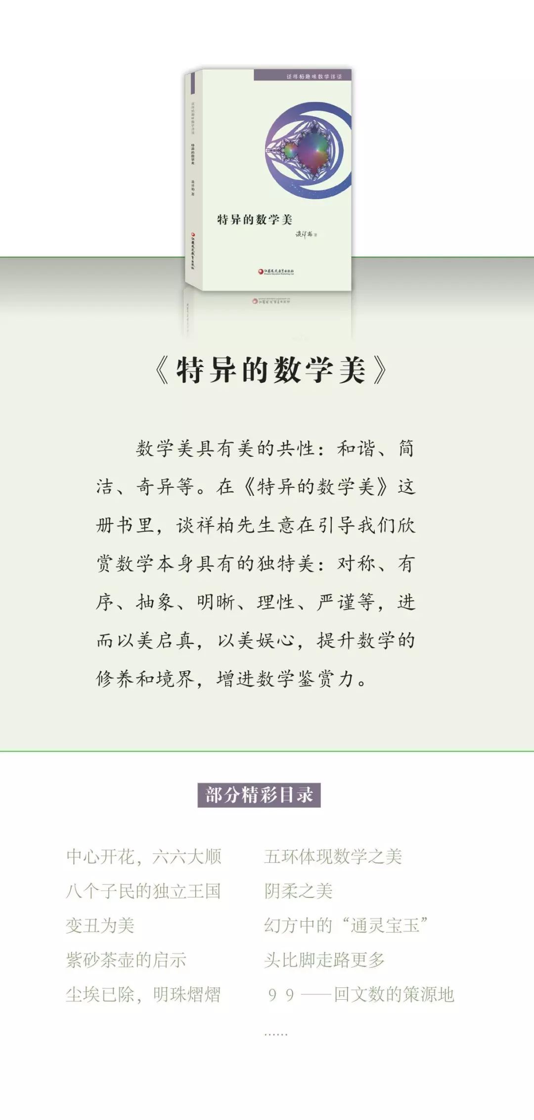 丛书中大部分作品系首次结集出版,所有作品经过深入研究、系统整理和精心编校。尤其是谈祥柏先生发表在《科学》《科学画报》《小学数学教师》《教育研究与评论》等期刊上的文章,对于一些类别自然数的本性的研究,对于数学与科学、文史、艺术关联性的探求,对于许多趣味数学内容背景的发掘等,深入而独特,兼具学术性、趣味性和人文性,令人回味无穷, 脑洞大开,对于广大中小学师生增进数学兴趣、拓展数学思维、提高数学素养、培养创新意识大有裨益。