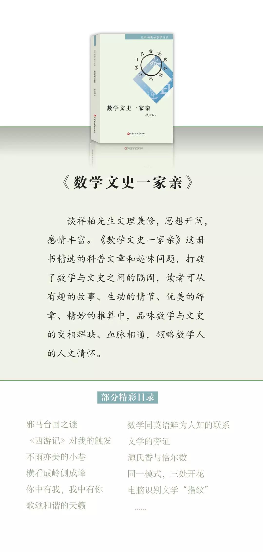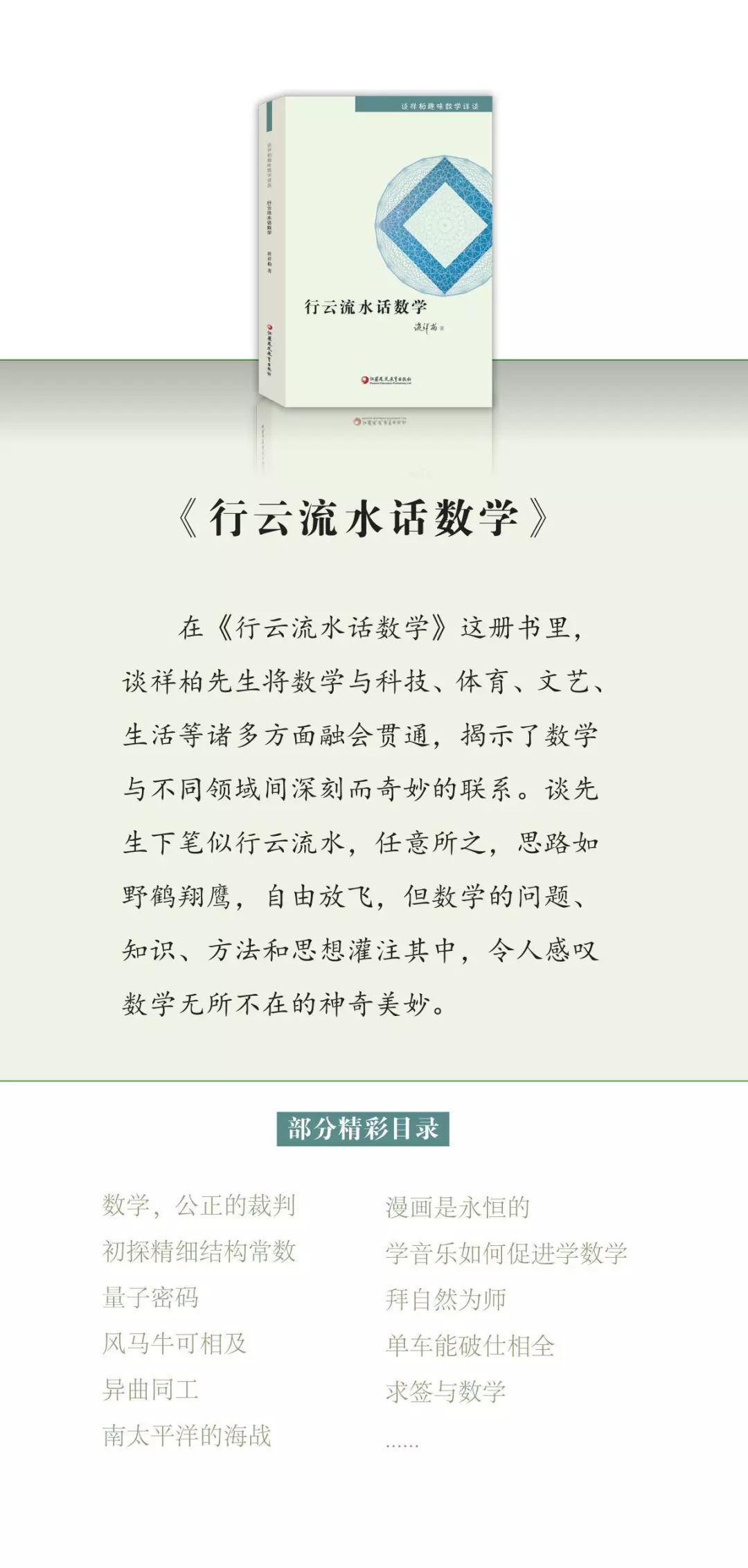 近日,数学科普丛书《谈祥柏趣味数学详谈》由江苏凤凰教育出版社正式出版。该丛书是我国数学科普大家谈祥柏教授具有“代全集”性质的十卷本文集,反映了谈祥柏教授数学科普创作的代表性成果和鲜明的个人风格。谈教授的数学科普作品,文理交融,奇趣横生,雅俗共赏,自出机杼,堪称数学文化宝库中独放异彩的明珠。