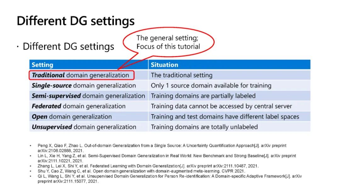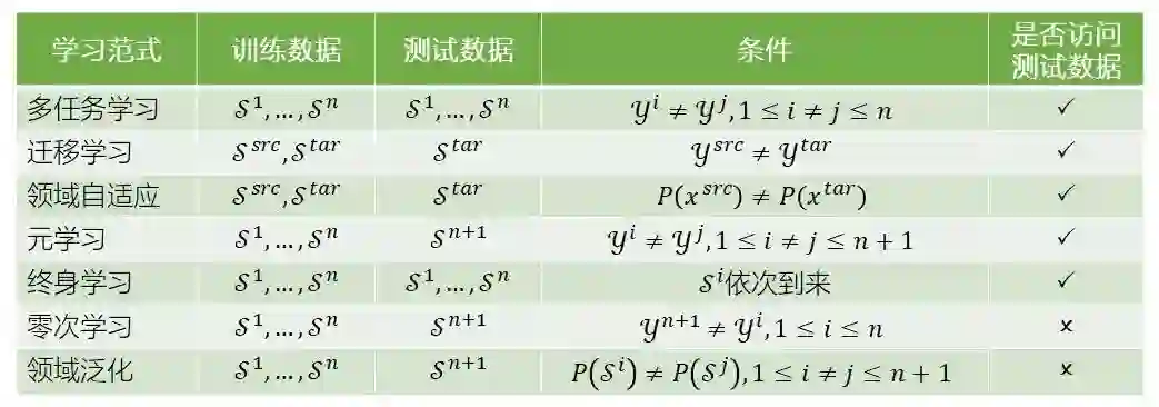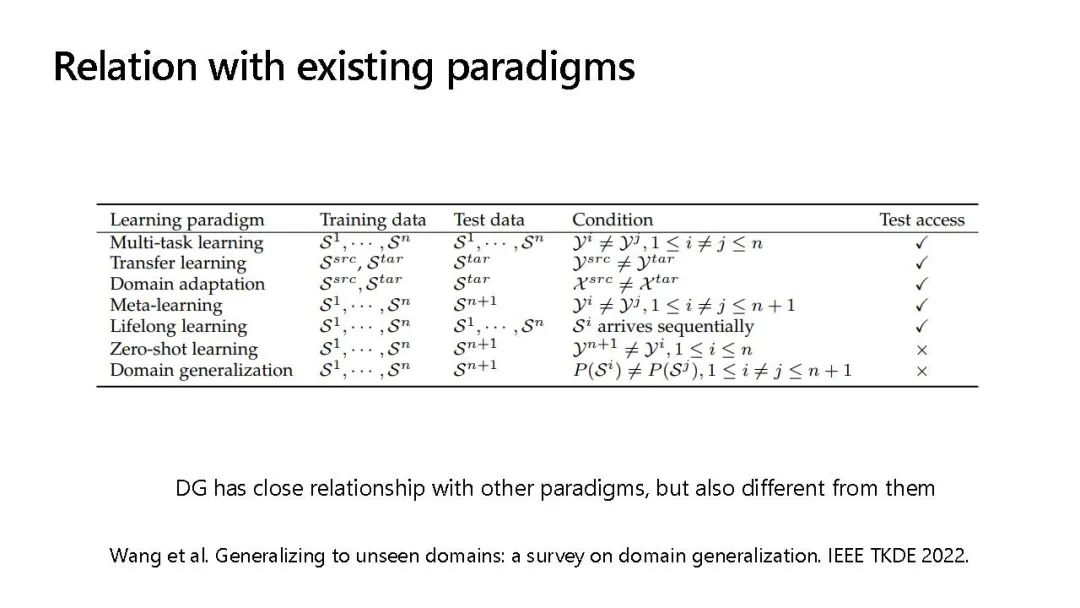 领域泛化不仅与领域自适应问题有相似之处,其与多任务学习、迁移学习、元学习、终身学习等,都有一些类似和差异之处。我们在下表中对它们的差异进行了总结。