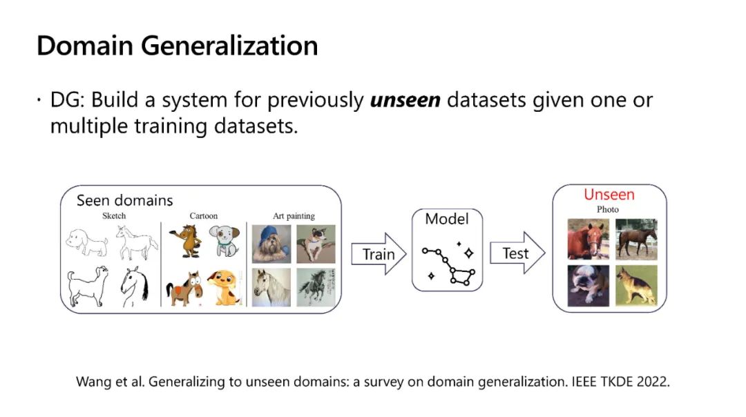 例如,在下图中,领域自适应问题假定训练集和测试集都可以在训练过程中被访问,而领域泛化问题中则只有训练集。