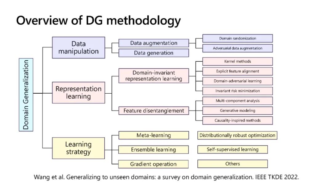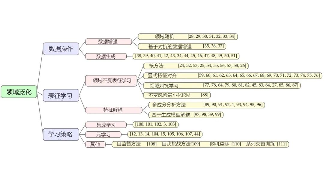 领域泛化方法是我们的核心。我们将已有的领域泛化方法按照数据操作、表征学习、学习策略分为三大方面,如下图所示。