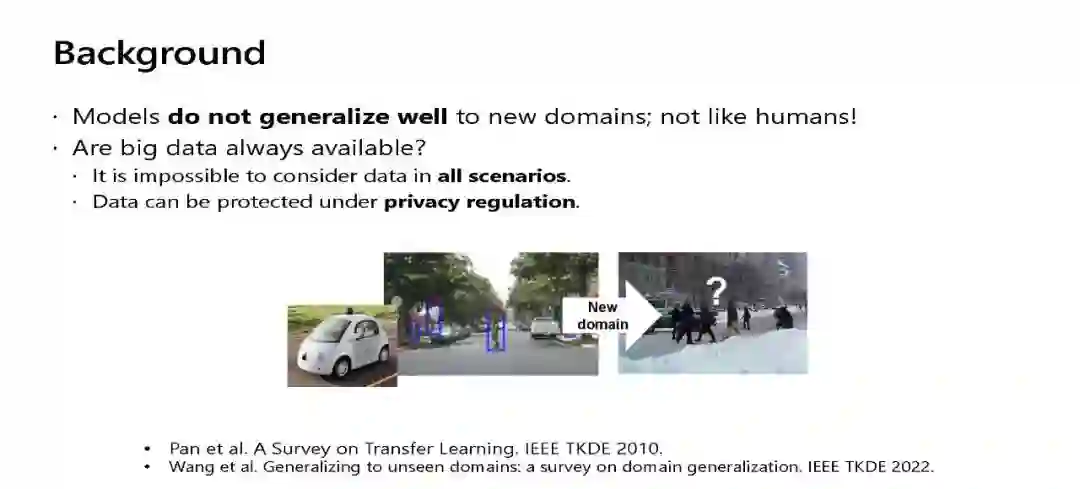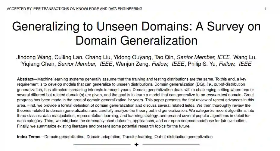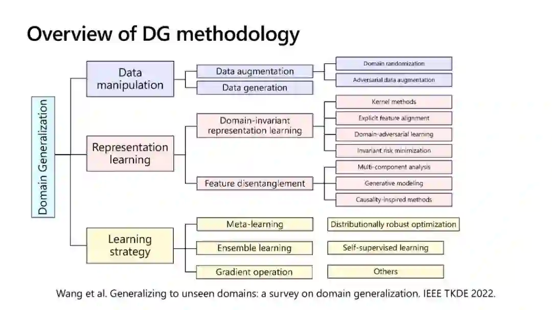 机器学习模型在很大程度上依赖于海量训练数据的可用性。对于资源匮乏、标签良好的数据难以获取的场景,进行跨领域知识转移非常重要,即从现有领域向目标领域进行知识转移。针对这一问题,迁移学习和领域适应研究取得了很大进展。除了这些进步之外,学习能够在任何新的看不见的环境中很好地推广的模型也是非常重要的。这促使研究社区开发算法,以更好地利用现有的训练领域,同时处理它们的分布转移。
