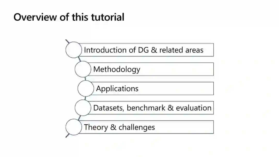 本教程致力于介绍领域泛化(DG)的最新进展。与假设目标域数据可用性的迁移学习和域适应不同,DG更进一步,不需要访问目标数据。DG的目的是从一个或多个具有不同概率分布的训练域学习一个广义模型,并能很好地实现非分布泛化。潜在受众将是机器学习研究人员和行业从业者,对迁移学习、领域适应和泛化特别感兴趣。我们的教程旨在使这些技术在实际应用中更容易学习和使用。