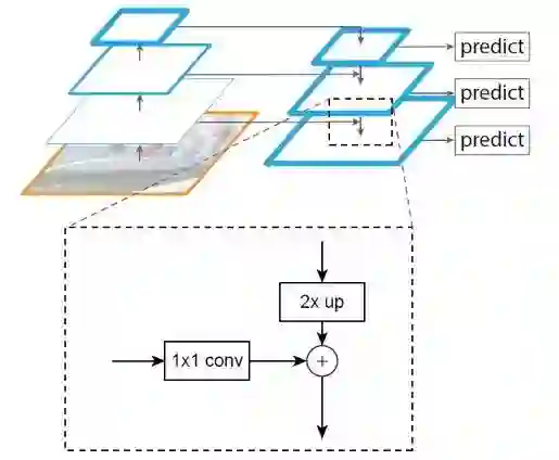 2017 年 Facebook 的 Tsung-Yi Lin 等提出了 FPN 算法,利用不同层的特征图进行不同尺寸的目标预测。原来多数的目标检测算法都是只采用深层特征做预测,低层的特征语义信息比较少,但是目标位置准确;高层的特征语义信息比较丰富,但是目标位置比较粗略。另外虽然也有些算法采用多尺度特征融合的方式,但是一般是采用融合后的特征做预测,而 FPN 算法不一样的地方在于预测是在不同特征层独立进行的,利用深层特征通过上采样和低层特征做融合。