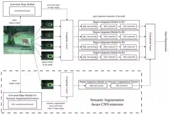 分类问题由 Multi-Region CNN Model 和 Semantic Segmentation-Aware CNN Model 组成。前者的候选框由 Selective Search 得到,对于每一个样本区域,取 10 个区域分别提取特征后拼接,这样可以强制网络捕捉物体的不同方面,同时可以增强网络对于定位不准确的敏感性,其中 adaptive max pooling 即 ROI max pooling;后者使用 FCN 进行目标分割,将最后一层的 feature map 和前者产生的 feature map 拼接,作为最后的 feature map。