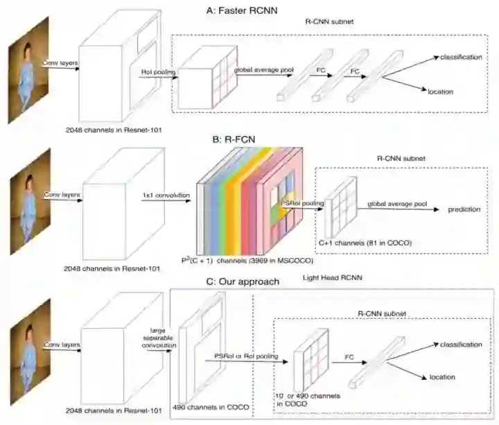 2017 年 12 月 Face++提出了一种为了使 two stage 的检测算法 Light-Head R-CNN,主要探讨了 R-CNN 如何在物体检测中平衡精确度和速度。Light-Head R-CNN 提出了一种更好的 two-stage detector 设计结构,使用一个大内核可分卷积和少量通道生成稀疏的特征图。该设计的计算量使随后的 ROI 子网络计算量大幅降低,检测系统所需内存减少。将一个廉价的全连接层附加到池化层上,充分利用分类和回归的特征表示。因其轻量级头部结构,该检测器能够实现速度和准确率之间的最优权衡,不管使用的是大主干网络还是小主干网络。