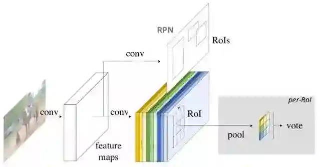 随着全卷积网络的出现,2016 年微软研究院的 Jifeng Dai 等提出 R-FCN 算法。相较于 Faster R-CNN 算法只能计算 ROI pooling 层之前的卷积网络特征参数,R-FCN 算法提出一种位置敏感分布的卷积网络代替 ROI pooling 层之后的全连接网络,解决了 Faster R-CNN 由于 ROI Pooling 层后面的结构需要对每一个样本区域跑一次而耗时比较大的问题,使得特征共享在整个网络内得以实现,解决物体分类要求有平移不变性和物体检测要求有平移变化的矛盾,但是没有考虑到 region proposal 的全局信息和语义信息。