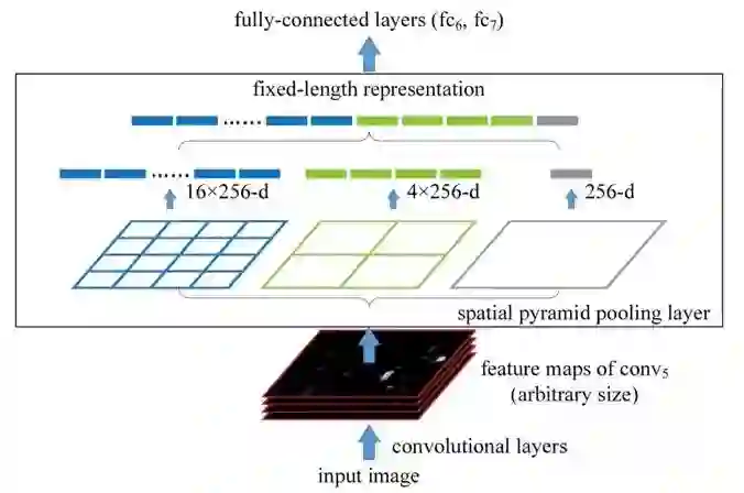 针对卷积神经网络重复运算问题,2015 年微软研究院的何恺明等提出一种 SPP-Net 算法,通过在卷积层和全连接层之间加入空间金字塔池化结构(Spatial Pyramid Pooling)代替 R-CNN 算法在输入卷积神经网络前对各个候选区域进行剪裁、缩放操作使其图像子块尺寸一致的做法。利用空间金字塔池化结构有效避免了 R-CNN 算法对图像区域剪裁、缩放操作导致的图像物体剪裁不全以及形状扭曲等问题,更重要的是解决了卷积神经网络对图像重复特征提取的问题,大大提高了产生候选框的速度,且节省了计算成本。但是和 R-CNN 算法一样训练数据的图像尺寸大小不一致,导致候选框的 ROI 感受野大,不能利用 BP 高效更新权重。