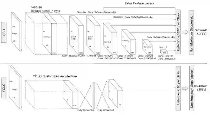 针对 YOLO 类算法的定位精度问题,2016 年 12 月北卡大学教堂山分校的 Wei Liu 等提出 SSD 算法,将 YOLO 的回归思想和 Faster R-CNN 的 anchor box 机制结合。通过在不同卷积层的特征图上预测物体区域,输出离散化的多尺度、多比例的 default boxes 坐标,同时利用小卷积核预测一系列候选框的边框坐标补偿和每个类别的置信度。在整幅图像上各个位置用多尺度区域的局部特征图边框回归,保持 YOLO 算法快速特性的同时,也保证了边框定位效果和 Faster R-CNN 类似。但因其利用多层次特征分类,导致其对于小目标检测困难,最后一个卷积层的感受野范围很大,使得小目标特征不明显。
