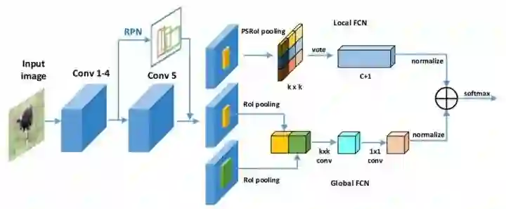 CoupleNet 结构利用三支并行网络实现检测,上面的支路网络使用原本的 R-FCN 结构的位置敏感分布图提取目标的局部信息;中间的支路网络用于提取目标的全局信息,对于一个 region proposal,依次通过 K×K 的 ROI Pooling,K×K 的 conv 以及 1×1 的 conv;下面的支路网络用于提取目标的语义信息,对于一个 region proposal,首先选择以这个 proposal 为中心,面积是原来 2 倍的 proposal,同样依次通过 K×K 的 ROI Pooling,K×K 的 conv 以及 1×1 的 conv。最后先各自通过 1×1 的 conv 调整激活值的尺寸,然后把 Local FCN 和 Global FCN 结果对应位置元素相加,再通过一个 softmax 实现分类。