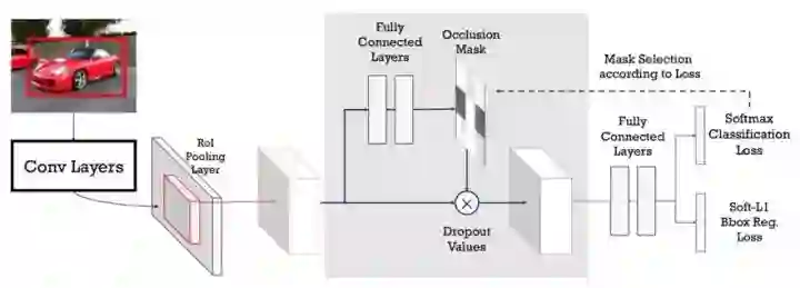 ASDN 利用 Fast R-CNN 中 ROI 池化层之后的每个目标 proposal 卷积特征作为对抗网络的输入,给定一个目标的特征,ASDN 尝试生成特征某些部分被 dropout 的掩码,导致检测器无法识别该物体。在前向传播过程中,首先使用 ASDN 在 ROI 池化层之后生成特征掩码,然后使用重要性采样法生成二值掩码,使用该掩码将特征对应部位值清零,修改后的特征继续前向传播计算损失,这个过程生成了困难的特征,用于训练检测器。